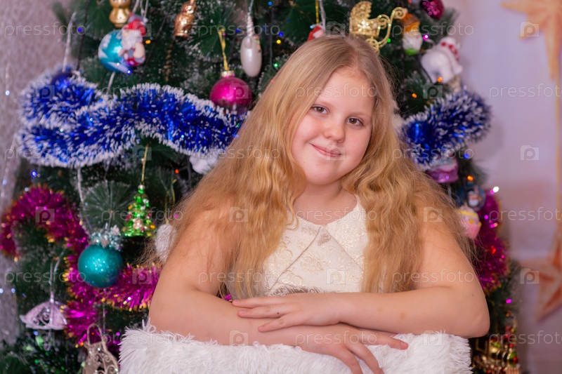 Красивая нарядная девочка возле елки в Новый год. Праздник. Новый год. Ребенок-модель. Красивая элегантная девушка рядом с рождественской ёлкой в Новый год. Отпуск. Новый год. Ребёнок является моделью