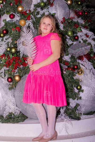 Красивая нарядная девочка возле елки в Новый год. Праздник. Новый год. Ребенок-модель. Красивая элегантная девушка рядом с рождественской ёлкой в Новый год. Отпуск. Новый год. Ребёнок является моделью