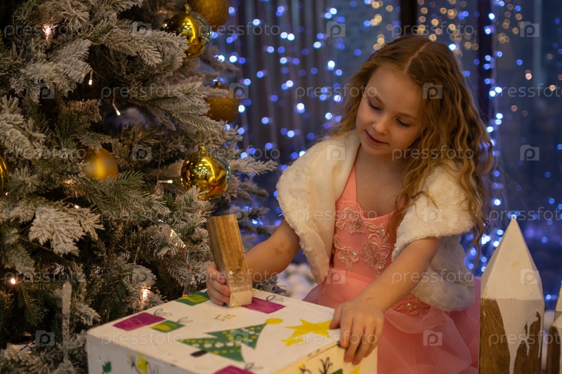 Красивая нарядная девочка возле елки в Новый год. Праздник. Новый год. Ребенок-модель. Красивая элегантная девушка рядом с рождественской ёлкой в Новый год. Отпуск. Новый год. Ребёнок является моделью