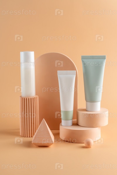 Группа белых и зеленых пустых баночек и тюбиков с косметическим кремом без торговой марки на бежевом фоне на бетонных подиумах. Презентация средств по уходу за кожей. Элегантный макет. Уход за кожей, красота и спа