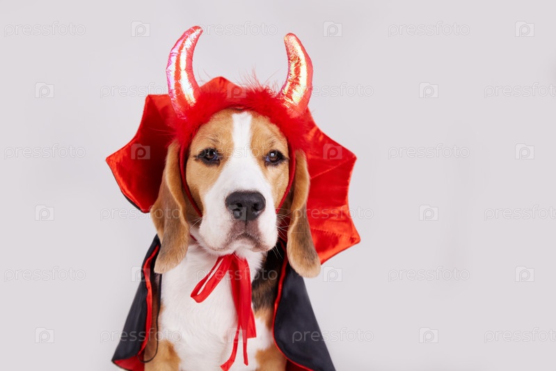 Собака-бигль с рогами дьявола и накидкой в качестве забавного наряда на Хэллоуин