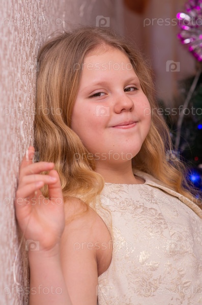 Красивая нарядная девочка возле елки в Новый год. Праздник. Новый год. Ребенок-модель. Красивая элегантная девушка рядом с рождественской ёлкой в Новый год. Отпуск. Новый год. Ребёнок является моделью