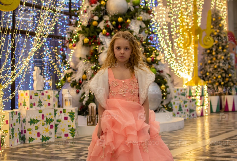 Красивая нарядная девочка возле елки в Новый год. Праздник. Новый год. Ребенок-модель. Красивая элегантная девушка рядом с рождественской ёлкой в Новый год. Отпуск. Новый год. Ребёнок является моделью