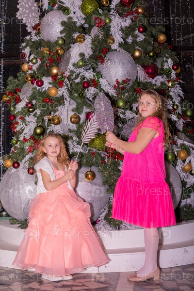 Красивые красиво одетые девушки возле елки в Новый год. Праздник. Новый год. Дети-модели. Две сестры. Красивые элегантные девочки рядом с рождественской ёлкой в Новый год. Отпуск. Новый год. Дети - модели. Две сестры