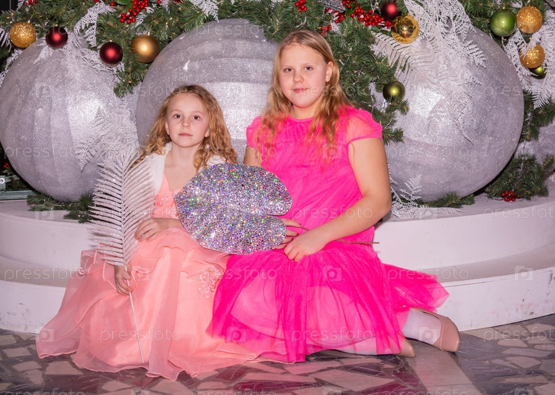 Красивые красиво одетые девушки возле елки в Новый год. Праздник. Новый год. Дети-модели. Две сестры. Красивые элегантные девочки рядом с рождественской ёлкой в Новый год. Отпуск. Новый год. Дети - модели. Две сестры