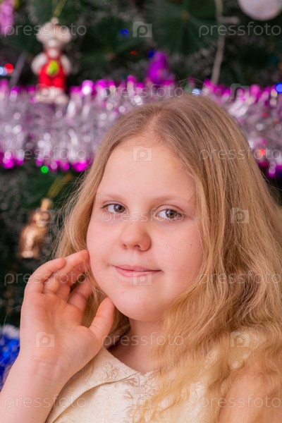 Красивая нарядная девочка возле елки в Новый год. Праздник. Новый год. Ребенок-модель. Красивая элегантная девушка рядом с рождественской ёлкой в Новый год. Отпуск. Новый год. Ребёнок является моделью