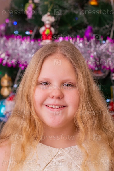 Красивая нарядная девочка возле елки в Новый год. Праздник. Новый год. Ребенок-модель. Красивая элегантная девушка рядом с рождественской ёлкой в Новый год. Отпуск. Новый год. Ребёнок является моделью