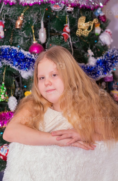 Красивая нарядная девочка возле елки в Новый год. Праздник. Новый год. Ребенок-модель. Красивая элегантная девушка рядом с рождественской ёлкой в Новый год. Отпуск. Новый год. Ребёнок является моделью