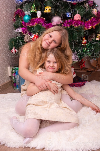Красивые красиво одетые девушки возле елки в Новый год. Праздник. Новый год. Дети-модели. Две сестры. Красивые элегантные девочки рядом с рождественской ёлкой в Новый год. Отпуск. Новый год. Дети - модели. Две сестры