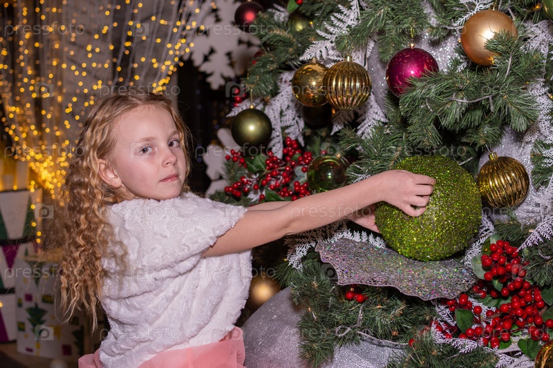 Красивая нарядная девочка возле елки в Новый год. Праздник. Новый год. Ребенок-модель. Красивая элегантная девушка рядом с рождественской ёлкой в Новый год. Отпуск. Новый год. Ребёнок является моделью