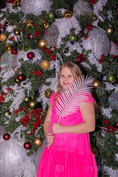 Красивая нарядная девочка возле елки в Новый год. Праздник. Новый год. Ребенок-модель. Красивая элегантная девушка рядом с рождественской ёлкой в Новый год. Отпуск. Новый год. Ребёнок является моделью
