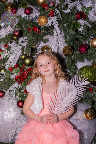 Красивая нарядная девочка возле елки в Новый год. Праздник. Новый год. Ребенок-модель. Красивая элегантная девушка рядом с рождественской ёлкой в Новый год. Отпуск. Новый год. Ребёнок является моделью