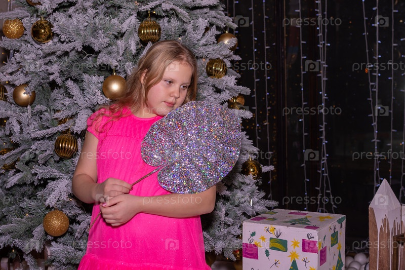 Красивая нарядная девочка возле елки в Новый год. Праздник. Новый год. Ребенок-модель. Красивая элегантная девушка рядом с рождественской ёлкой в Новый год. Отпуск. Новый год. Ребёнок является моделью