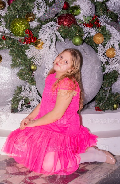 Красивая нарядная девочка возле елки в Новый год. Праздник. Новый год. Ребенок-модель. Красивая элегантная девушка рядом с рождественской ёлкой в Новый год. Отпуск. Новый год. Ребёнок является моделью