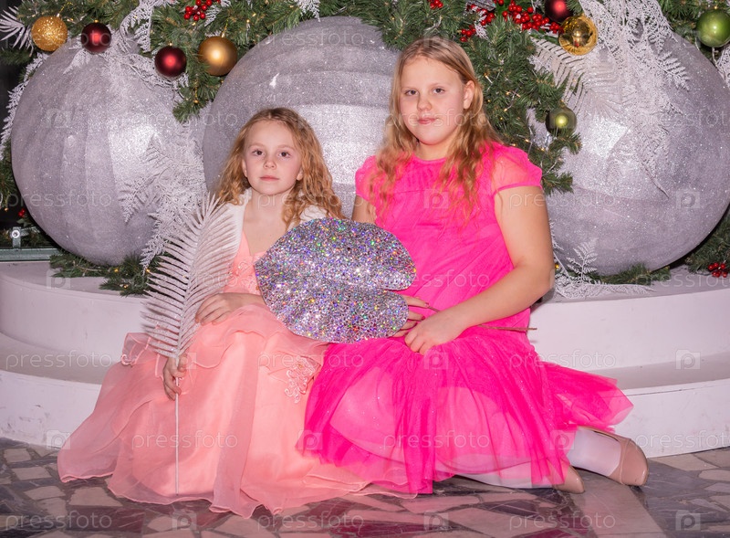 Красивые красиво одетые девушки возле елки в Новый год. Праздник. Новый год. Дети-модели. Две сестры. Красивые элегантные девочки рядом с рождественской ёлкой в Новый год. Отпуск. Новый год. Дети - модели. Две сестры