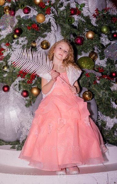 Красивая нарядная девочка возле елки в Новый год. Праздник. Новый год. Ребенок-модель. Красивая элегантная девушка рядом с рождественской ёлкой в Новый год. Отпуск. Новый год. Ребёнок является моделью