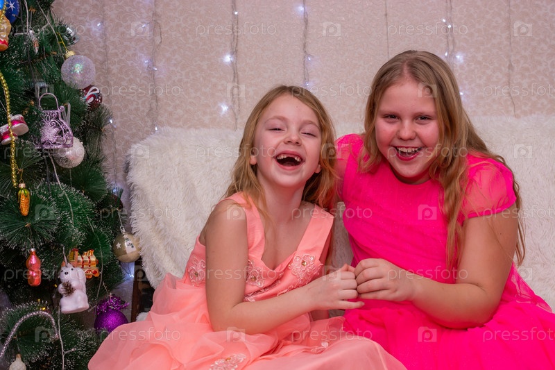 Красивые красиво одетые девушки возле елки в Новый год. Праздник. Новый год. Дети-модели. Две сестры. Красивые элегантные девочки рядом с рождественской ёлкой в Новый год. Отпуск. Новый год. Дети - модели. Две сестры