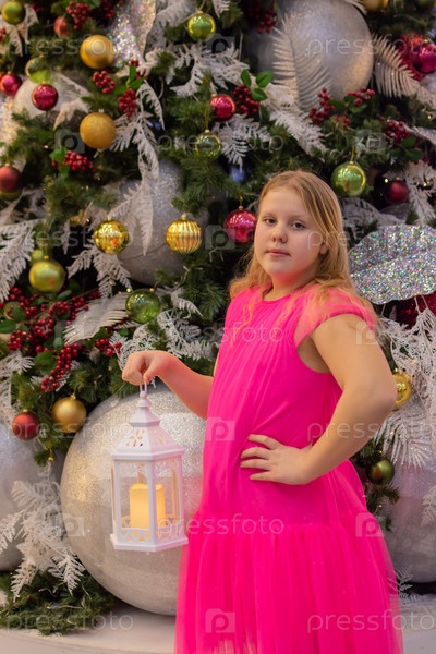 Красивая нарядная девочка возле елки в Новый год. Праздник. Новый год. Ребенок-модель. Красивая элегантная девушка рядом с рождественской ёлкой в Новый год. Отпуск. Новый год. Ребёнок является моделью