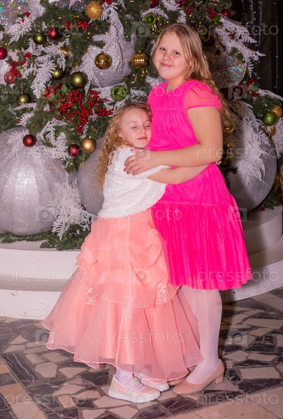 Красивые красиво одетые девушки возле елки в Новый год. Праздник. Новый год. Дети-модели. Две сестры. Красивые элегантные девочки рядом с рождественской ёлкой в Новый год. Отпуск. Новый год. Дети - модели. Две сестры
