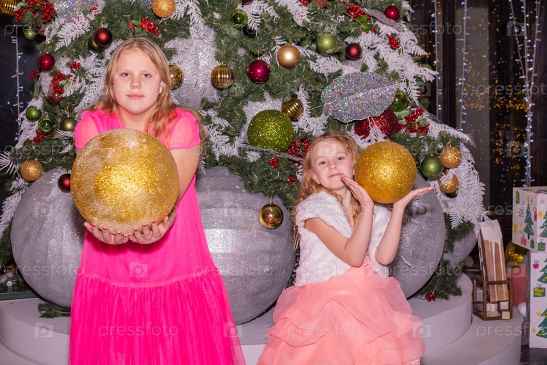 Красивые красиво одетые девушки возле елки в Новый год. Праздник. Новый год. Дети-модели. Две сестры. Красивые элегантные девочки рядом с рождественской ёлкой в Новый год. Отпуск. Новый год. Дети - модели. Две сестры
