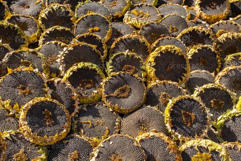 Собранные подсолнухи с семенами на фермерском рынке