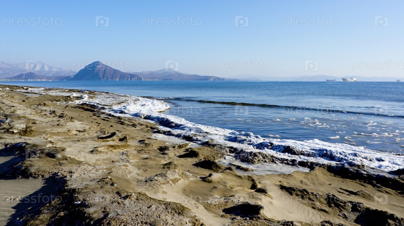 Зимний морской пейзаж с кораблями на горизонте