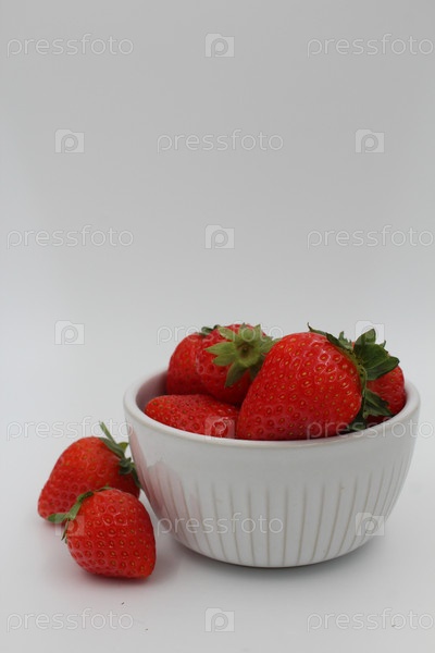Клубника в белой керамической миске на белом фоне