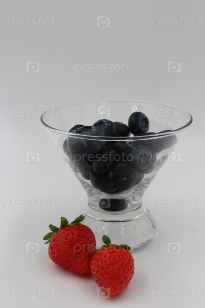 Ягоды голубики в стеклянной креманке и ягоды клубники на белом фоне