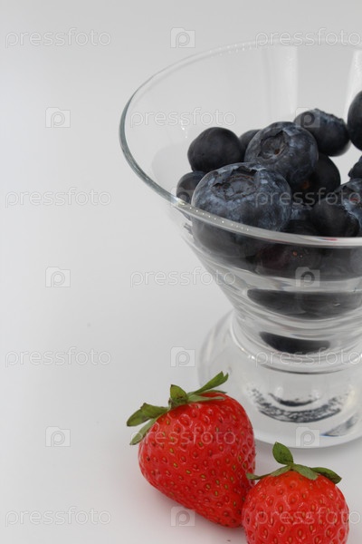 Ягоды голубики в стеклянной креманке и ягоды клубники крупным планом на белом фоне