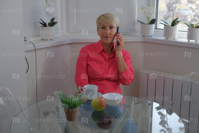 Взрослая женщина пенсионер с телефоном за кухонным столом на кухне