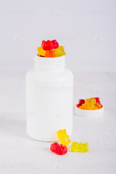 Бутылка с мармеладными витаминными добавками в форме медведей на столе, вертикальный вид