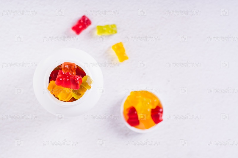 Крупным планом бутылка с липкими витаминными добавками в форме медведей на столе