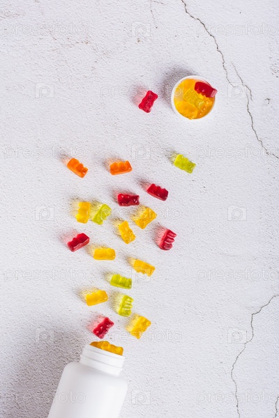 Бутылка с мармеладными витаминными добавками в форме медведей на столе и вертикальный вид