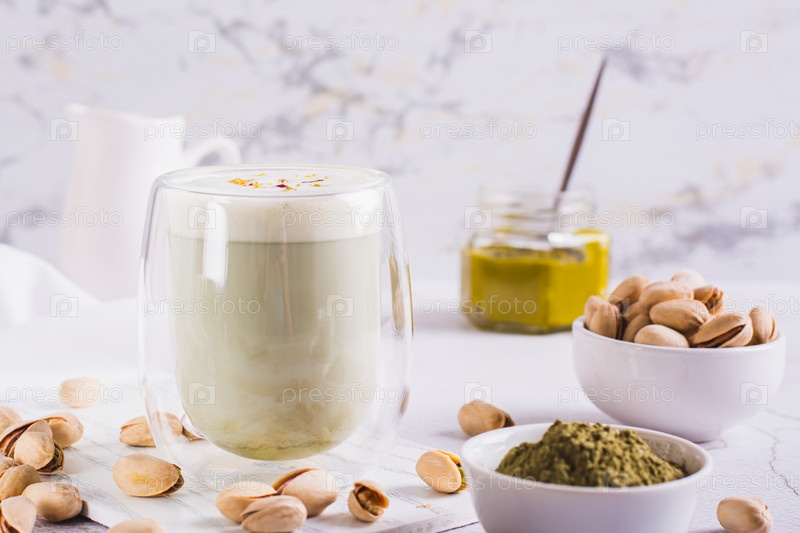 Чай матча с фисташками, разложенными в стакане, и орехами на столе