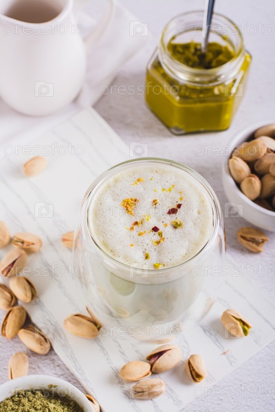 Фисташковый маття-латте в чашке и орехи в миске и на столе, вертикальный вид