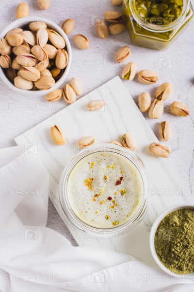 Фисташковый маття-латте в чашке и орехи в миске и на столе и вертикальный вид