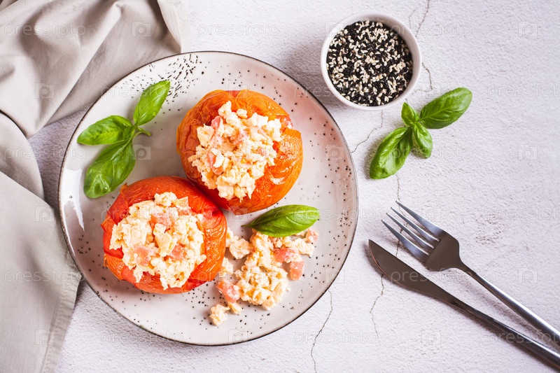 Половинки запеченных помидоров с начинкой из яичницы и базилика на тарелке, вид сверху стола