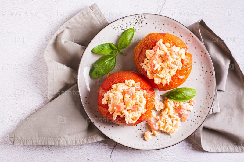 Крупный план половинок запеченных помидоров с яичницей и базиликом на тарелке, вид сверху