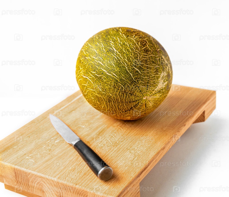 На разделочной доске на белом фоне лежит спелая дыня, рядом с ней лежит ножка