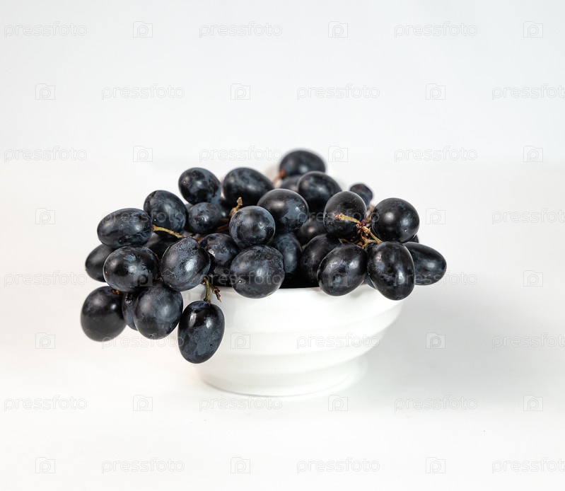 Гроздь черного винограда в белой миске на белом фоне