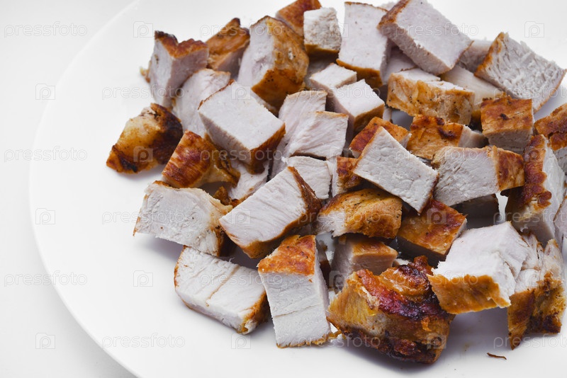 Кусочки жареной свинины на белой тарелке. Сочные и вкусные кусочки мяса шашлыка