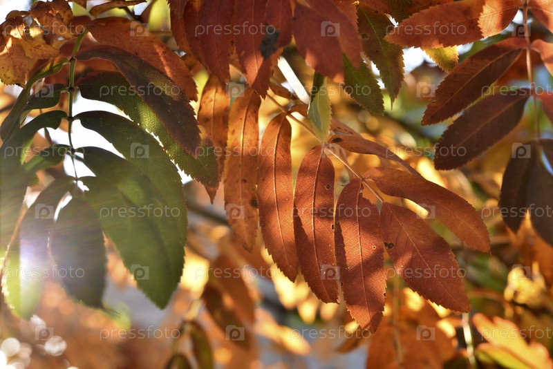 Желто-зелено-красные листья рябины осенью в лучах заходящего солнца. Красивые красочные осенние листья