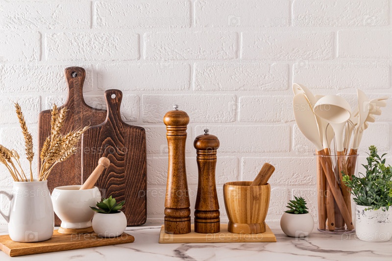Различная деревянная кухонная утварь и кухонные принадлежности на мраморной столешнице. Передний план. Стильный кухонный фон