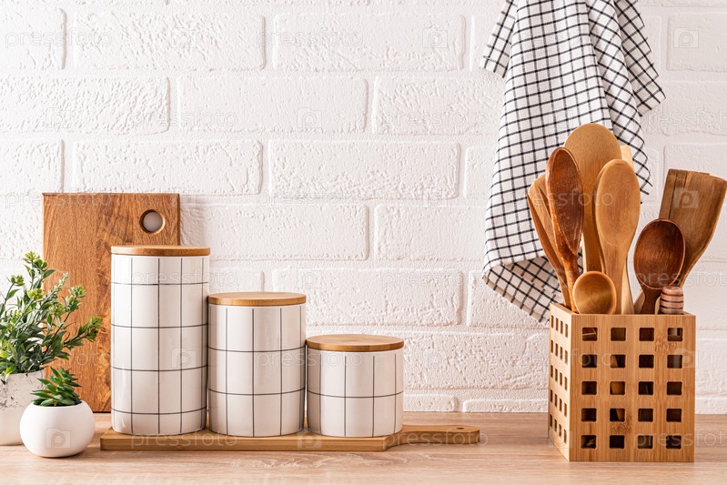 Красивый кухонный фон с набором разделочных досок, деревянных ложек, стильных керамических банок для хранения. Передний план. Экологичная кухня