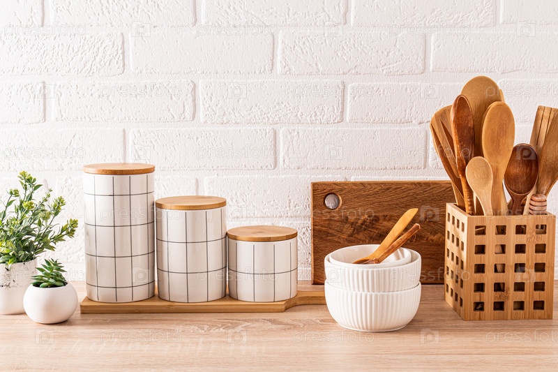 Красивый кухонный фон с набором разделочных досок, деревянных ложек, мисок, стильных керамических банок для хранения. Передний план. Экологичная кухня