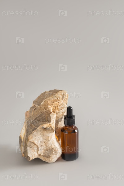 Косметическая бутылка из янтарного стекла с капельницей с сывороткой или косметическим маслом для ухода за кожей на сером фоне с натуральным камнем. Вертикальный вид