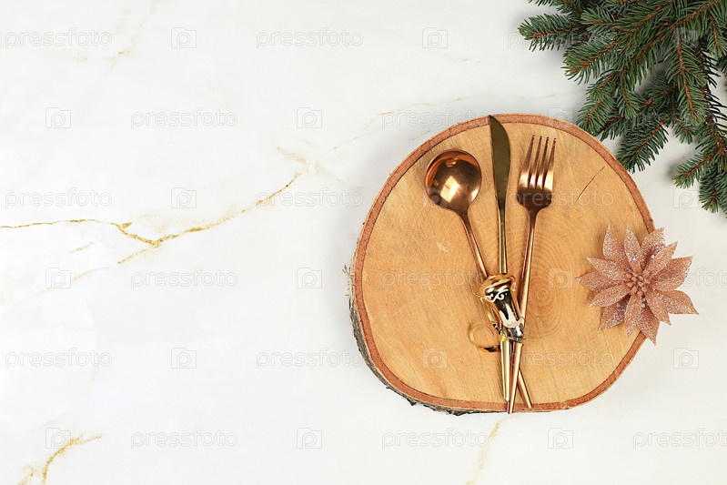 Сервировка рождественского стола. Праздничные новогодние столовые приборы с салфеткой на деревянной подставке, макет праздничного меню, праздничная композиция с еловыми ветками, кухонный фон