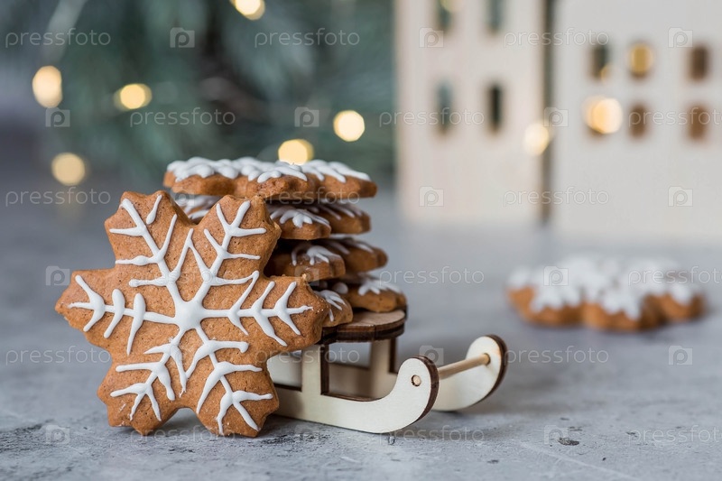 Рождественские пряники домашнего приготовления в сахарной пудре. Вкусные пряники на фоне боке елочных огней. Свежеиспеченные рождественские пряники