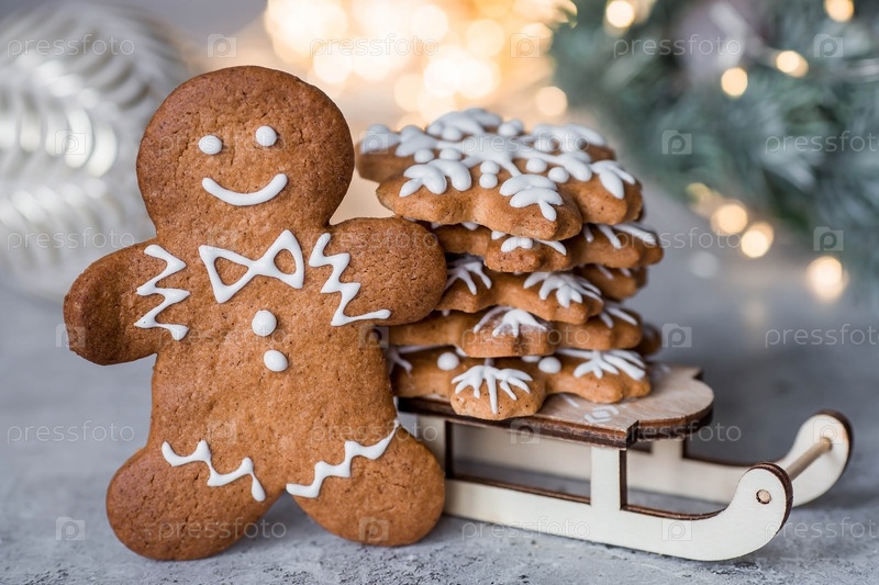 Рождественские пряники домашнего приготовления в сахарной пудре. Вкусные пряники на фоне боке елочных огней. Свежеиспеченные рождественские пряники