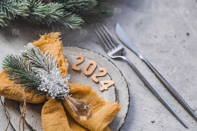 Сервировка стола. Стильные тарелки, салфетка, бокал, шампанское, елочные ветки и рождественские украшения на сером фоне. Концепция счастливого Рождества и Нового 2024 года